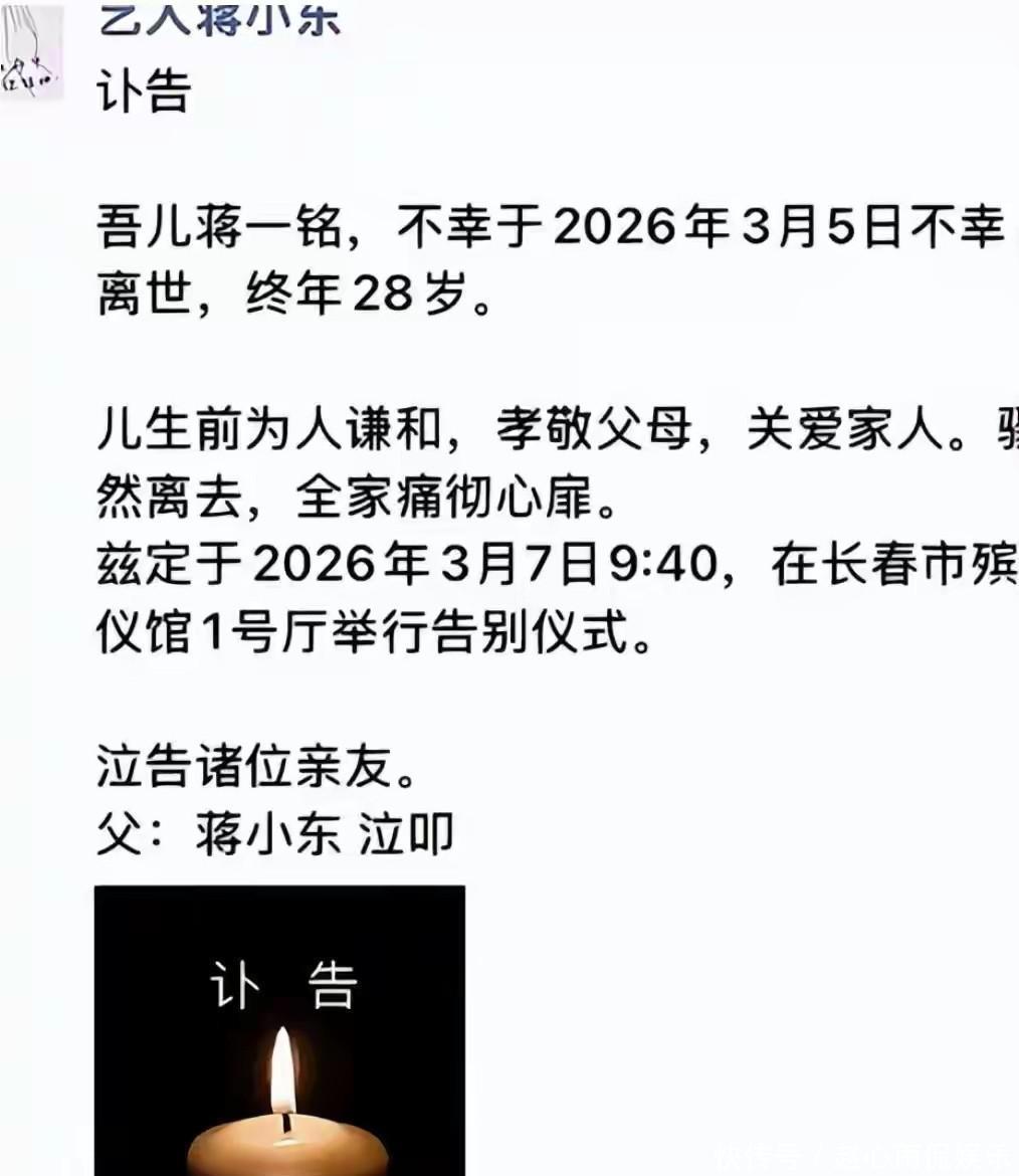 蒋小东的儿子蒋一茗已经离世,年仅28岁,这个消息是在3月6日由蒋小东本人发出来的,讣告里写得很克制,只说孩子于3月5日不幸离世,全家痛彻心扉,告别仪式定在3月7日举行。