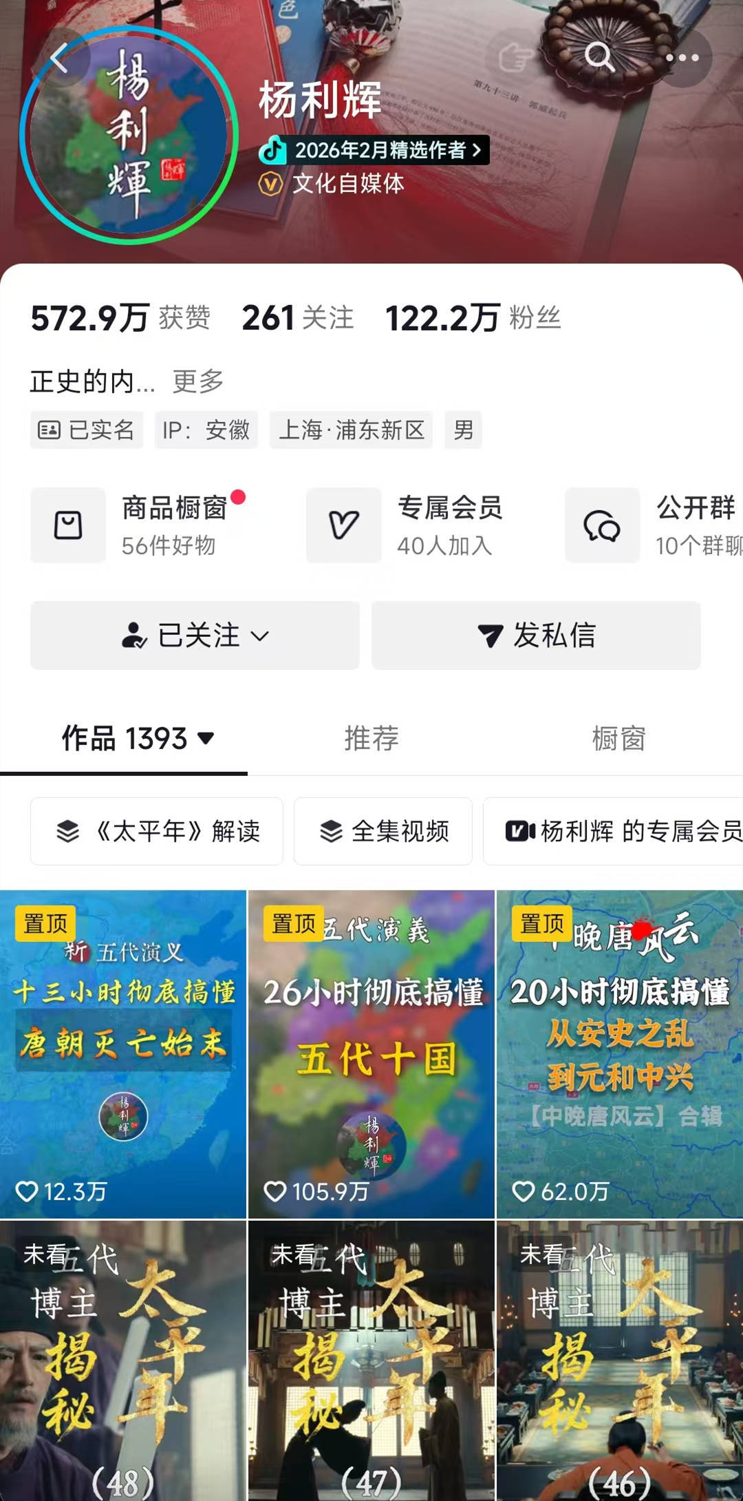 杨利辉的抖音账号主页。杨利辉对历史的敬畏与深耕,精准地回应了当下短视频时代更深层的文化渴求。当快节奏的“碎片化”内容充斥屏幕时,像杨利辉这样提供“系统知识”的创作者反而成了稀缺资源。